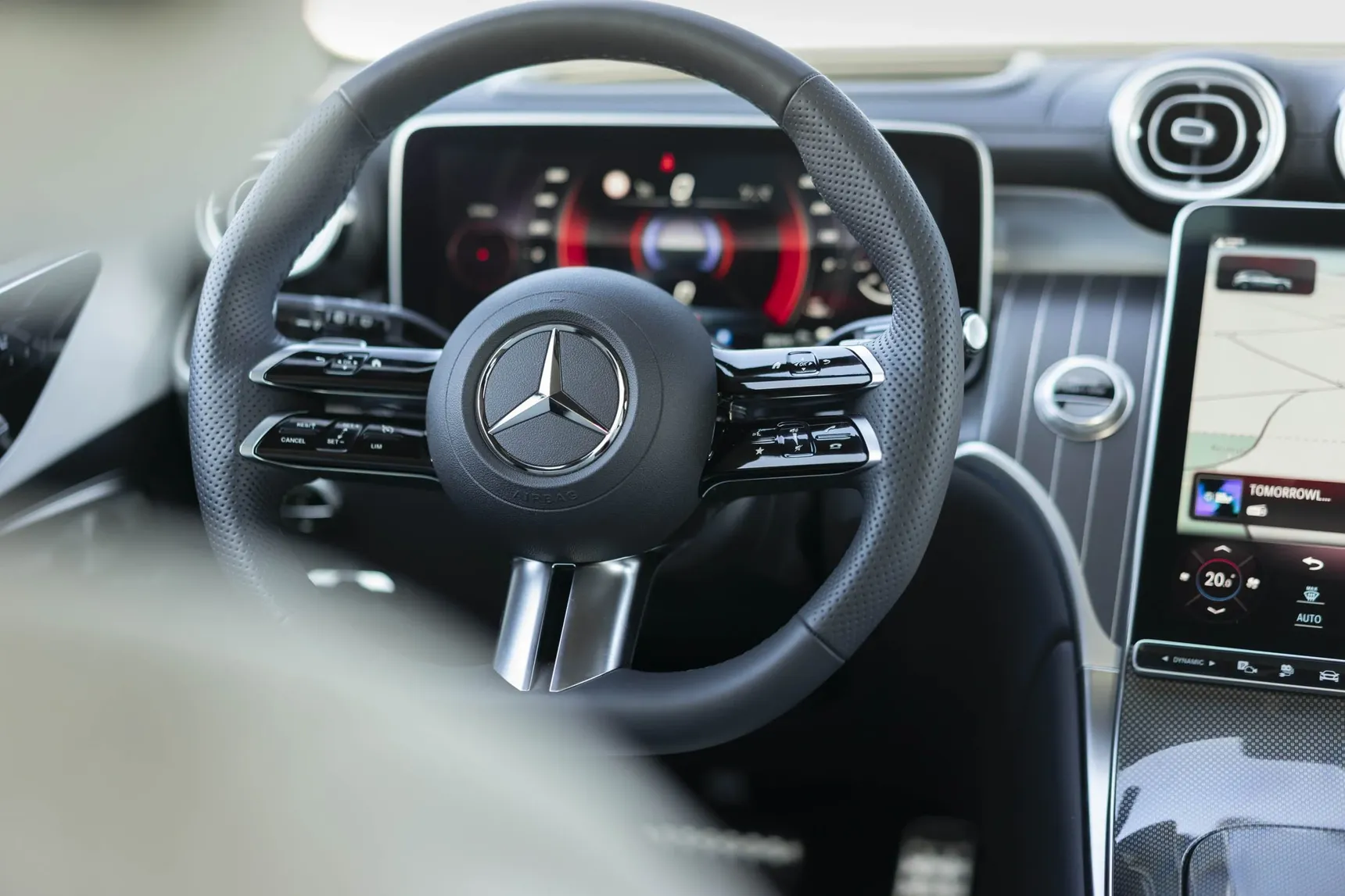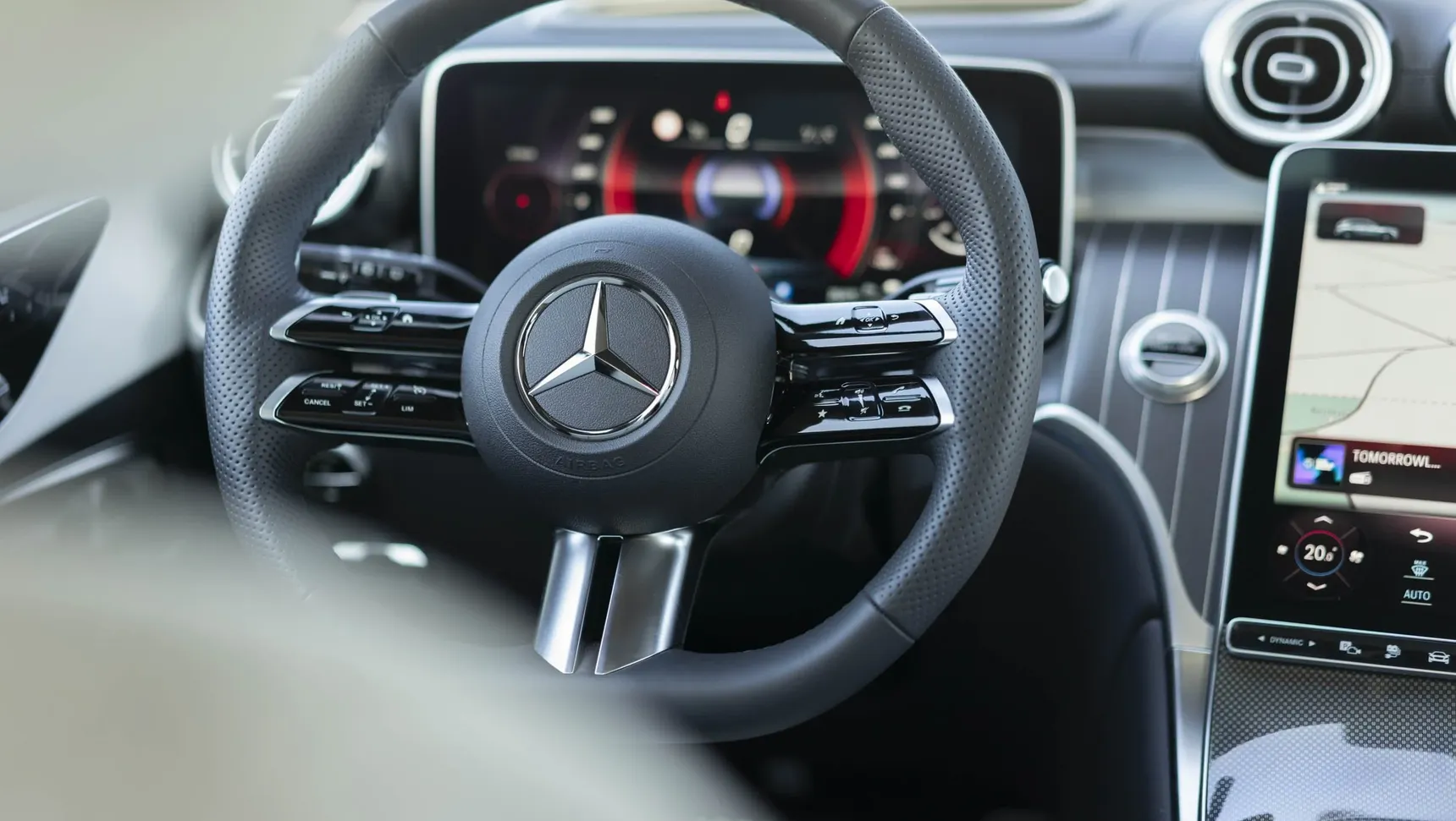 Niet enkel het platform wordt gedeeld met de C Klasse, maar ook veel, zeg maar bijna alle interieuronderdelen. Het dashboard krijgt het centrale rechtopstaande 11,9 inch touchscreen, aangevuld met een 12,3 inch digitaal instrumentenpaneel en een optioneel head up display. Ook op het stuurwiel vind je veel digitale aanraakknoppen. We wennen er langzaam aan en beginnen ze zelfs te appreciëren.